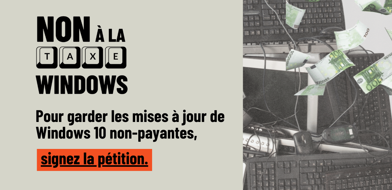 Signez la pétition - Le 14 octobre prochain, Microsoft va nous imposer une “taxe”. La multinationale va cesser les mises à jour gratuites de Windows 10 et forcer le passage à Windows 11.